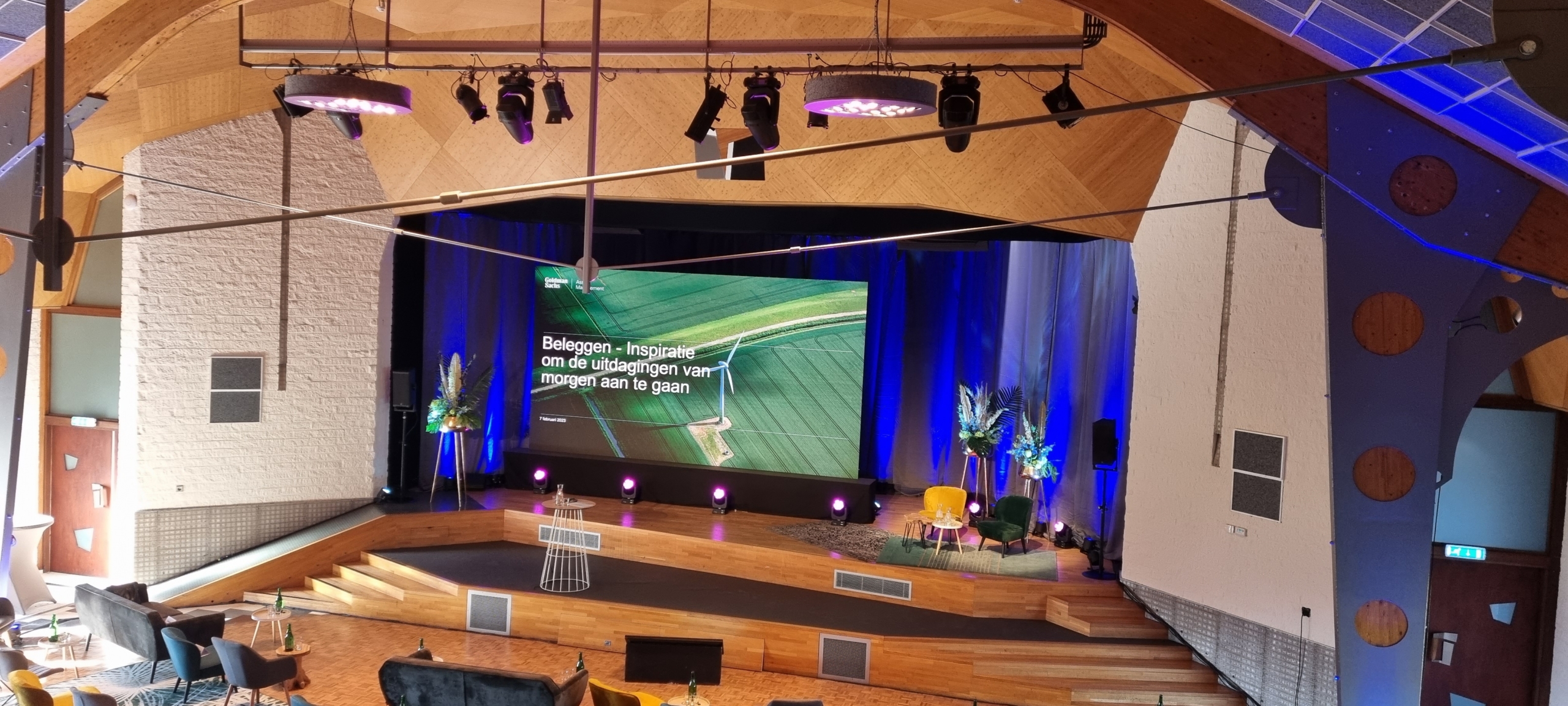 Zakelijk custom event Aansluiten bij flexibele wensen klant Huisstijl verwerken in lichtkleuren en presentatie Ondersteunen en bediening techniek bij event